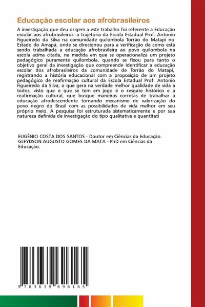 A investigação que deu origem a este trabalho foi referente a Educação escolar aos afrobrasileiros: a trajetória da Escola Estadual Prof. Antonio Figueiredo da Silva na comunidade quilombola Torrão do Matapí no Estado do Amapá, onde se direcionou para a verificação de como está sendo trabalhada a educação afrobrasileira ao povo quilombola na escola acima citada, na medida em que se operacionaliza um projeto pedagógico puramente quilombola, quando se fixou para tanto o objetivo geral da investigação que compreende Identificar a educação escolar dos afrobrasileiros da comunidade de Torrão do Matapí, registrando a história educacional com a proposição de um projeto pedagógico de reafirmação cultural da Escola Estadual Prof. Antonio Figueiredo da Silva, o que gera na verdade melhor qualidade de vida a todos, visto que o que se tem em jogo é o resgate histórico e a reafirmação cultural, que busque maneiras corretas de trabalhar a educação afrodescendente tornando mecanismo de valorização do povo negro do Brasil com as possibilidades de vida melhor em seu próprio meio. A pesquisa foi estruturada sistematicamente e por sua natureza definida de investigação do tipo qualitativa e quantitati