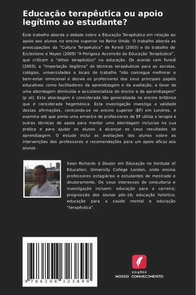 Este trabalho aborda o debate sobre a Educação Terapêutica em relação ao apoio aos alunos no ensino superior no Reino Unido. O trabalho aborda as preocupações da ¿Cultura Terapêuticä de Furedi (2003) e do trabalho de Ecclestone e Hayes (2009) ¿A Perigosa Ascensão da Educação Terapêuticä, que criticam o ¿ethos terapêutico¿ na educação. De acordo com Furedi (2003), a ¿importação ilegítimä de técnicas terapêuticas para as escolas, colégios, universidades e locais de trabalho ¿não consegue melhorar o bem-estar emocional e desvia os professores dos seus principais papéis educativos como facilitadores da aprendizagem e da avaliação, a favor de uma abordagem diminuída e assistencialista do ensino e da aprendizagem¿ (p vii). Esta abordagem é considerada tão generalizada no ensino britânico que é considerada hegemónica. Esta investigação investiga a validade destas afirmações, centrando-se no ensino superior (EF) em Londres, e examina até que ponto uma amostra de professores de EF utiliza a terapia e outras técnicas de apoio para manter uma abordagem inclusiva na sua prática e para ajudar os alunos a alcançar os seus resultados de aprendizagem. O estudo inclui as avaliações dos alunos sobre as intervenções dos professores e recomendações para um apoio eficaz aos alunos.