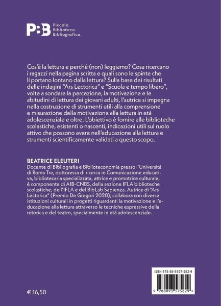 Cos'è la lettura e perché (non) leggiamo? Cosa ricercano i ragazzi nella pagina scritta e quali sono le spinte che li portano lontano dalla lettura? Sulla base dei risultati delle indagini "Ars Lectorica" e "Scuola e tempo libero", volte a sondare la percezione, la motivazione e le abitudini di lettura dei giovani adulti, l'autrice si impegna nella costruzione di strumenti utili alla comprensione e misurazione della motivazione alla lettura in età adolescenziale e oltre. L'obiettivo è fornire alle biblioteche scolastiche, esistenti o nascenti, indicazioni utili sul ruolo attivo che possono avere nell'educazione alla lettura e strumenti scientificamente validati a questo scopo.