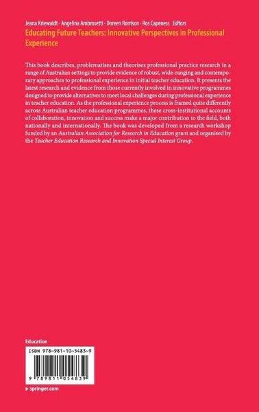 This book describes, problematises and theorises professional practice research in a range of Australian settings to provide evidence of robust, wide-ranging and contemporary approaches to professional experience in initial teacher education. It presents the latest research and evidence from those currently involved in innovative programmes designed to provide alternatives to meet local challenges during professional experience in teacher education. As the professional experience process is framed quite differently across Australian teacher education programmes, these cross-institutional accounts of collaboration, innovation and success make a major contribution to the field, both nationally and internationally. The book was developed from a research workshop funded by an Australian Association for Research in Education grant and organised by the Teacher Education Research and Innovation Special Interest Group.