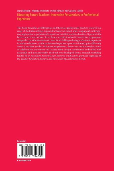 This book describes, problematises and theorises professional practice research in a range of Australian settings to provide evidence of robust, wide-ranging and contemporary approaches to professional experience in initial teacher education. It presents the latest research and evidence from those currently involved in innovative programmes designed to provide alternatives to meet local challenges during professional experience in teacher education. As the professional experience process is framed quite differently across Australian teacher education programmes, these cross-institutional accounts of collaboration, innovation and success make a major contribution to the field, both nationally and internationally. The book was developed from a research workshop funded by an Australian Association for Research in Education grant and organised by the Teacher Education Research and Innovation Special Interest Group.