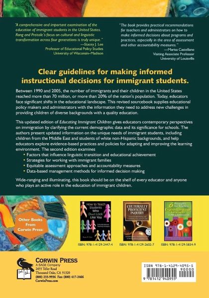 The updated edition will offer the most updated, useful, and relevant information on immigration and immigrant students. Rong and Preissle will help educators understand the significance of the demographic data on immigration and what it means to their schools. By analyzing various educational practices and policies, the authors guide educaotrs in finding evidence-based practices and policies that can improve the environment for immigrant studtents.