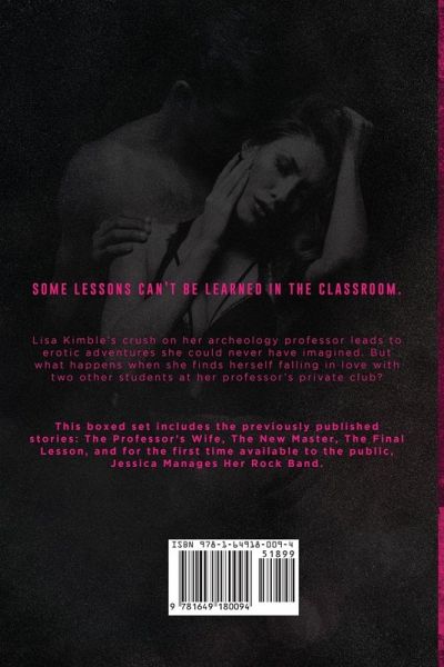 Some lessons can't be learned in the classroom. Lisa Kimble's crush on her archeology professor leads to erotic adventures she could never have imagined. But what happens when she find herself falling in love with two other students at her professor's private club? This boxed set includes the previously published stories: The Professor's Wife, The New Master, The Final Lesson, and for the first time available to the public, Jessica Manages Her Rock Band.