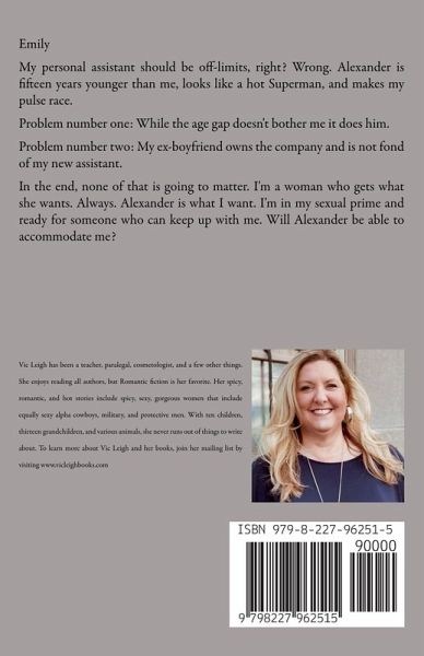 Emily My personal assistant should be off-limits, right? Wrong. Alexander is fifteen years younger than me, looks like a hot Superman, and makes my pulse race. Problem number one: While the age gap doesn't bother me it does him. Problem number two: My ex-boyfriend owns the company and is not fond of my new assistant. In the end, none of that is going to matter. I'm a woman who gets what she wants. Always. Alexander is what I want. I'm in my sexual prime and ready for someone who can keep up with me. Will Alexander be able to accommodate me?