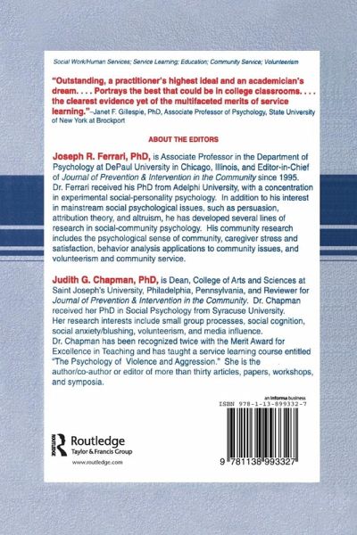 Contents An Introduction to Community-Based Service Learning (CBSL) * Learning to Serve: Predispositions and Motivations * Parental Helping Models, Gender, and Service Learning * Collegiate Service-Learning: Motives Underlying Volunteerism and Satisfaction with Volunteer Service * Community Volunteerism Among College Students and Professional Psychologists: Does Taking Them to the Streets Make-a-Difference? * Medical Student Motivations to Volunteer: Gender Differences and Comparisons to Other Volunteers * Service As Learning: Student, Faculty, and Community Outcomes * Clinical Application of the Service-Learning Model in Psychology: Evidence of Educational and Clinical Benefits * Faculty and Student Participation and Perceptions of Service-Learning Outcomes * Attitudinal and Academic Effects of Service Learning * Student Perceptions of the "Learning" in Service-Learning Courses * The Unintended Consequences of Volunteerism: Positive Outcomes for Those Who Serve * Learning Science for Social Good: Dynamic Tensions in Developing Undergraduate Community Researchers * Index * Reference Notes Included