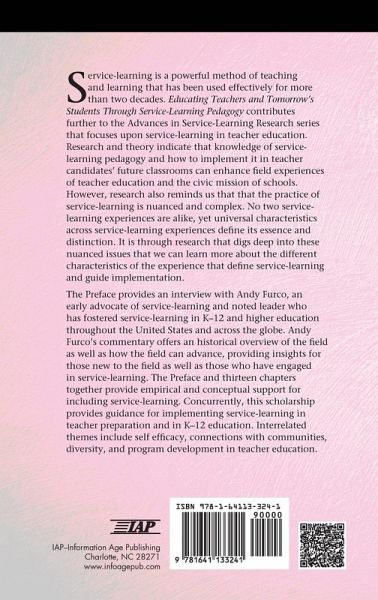 Service-learning is a powerful method of teaching and learning that has been used effectively for more than two decades. This volume contributes further to the Advances in Service-Learning Research series that focuses upon service-learning in teacher education. Research and theory indicate that knowledge of service-learning pedagogy and how to implement it in teacher candidates' future classrooms can enhance field experiences of teacher education and the civic mission of schools. However, research also reminds us that that the practice of service-learning is nuanced and complex. No two service-learning experiences are alike, yet universal characteristics across service-learning experiences define its essence and distinction. It is through research that digs deep into these nuanced issues that we can learn more about the different characteristics of the experience that define service-learning and guide implementation. The preface provides an interview with Andy Furco, an early advocate of service-learning and noted leader who has fostered service-learning in K-12 and higher education throughout the United States and across the globe. Andy Furco's commentary offers an historical overview of the field as well as how the field can advance, providing insights for those new to the field as well as those who have engaged in service-learning. The preface and thirteen chapters together provide empirical and conceptual support for including service-learning. Concurrently, this scholarship provides guidance for implementing service-learning in teacher preparation and in K-12 education. Interrelated themes include self efficacy, connections with communities, diversity, and program development in teacher education.