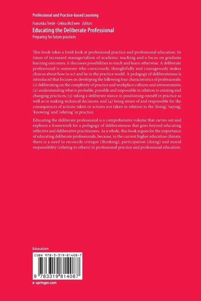 This book takes a fresh look at professional practice and professional education. In times of increased managerialism of academic teaching and a focus on graduate learning outcomes, it discusses possibilities to teach and learn otherwise. A deliberate professional is someone who consciously, thoughtfully and courageously makes choices about how to act and be in the practice world. A pedagogy of deliberateness is introduced that focuses on developing the following four characteristics of professionals: (1) deliberating on the complexity of practice and workplace cultures and environments; (2) understanding what is probable, possible and impossible in relation to existing and changing practices; (3) taking a deliberate stance in positioning oneself in practice as well as in making technical decisions; and (4) being aware of and responsible for the consequences of actions taken or actions not taken in relation to the 'doing', 'saying', 'knowing' and 'relating' in practice.