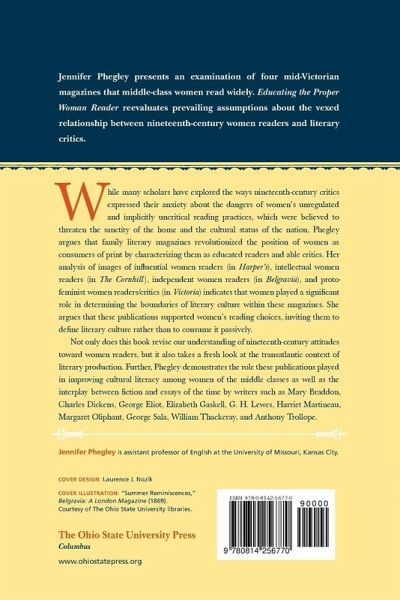 Jennifer Phegley presents an examination of four mid-Victorian magazines that middle-class women read widely. Educating the Proper Woman Reader reevaluates prevailing assumptions about the vexed relationship between nineteenth-century women readers and literary critics. While many scholars have explored the ways nineteenth-century critics expressed their anxiety about the dangers of women's unregulated and implicitly uncritical reading practices, which were believed to threaten the sanctity of the home and the cultural status of the nation, Phegley argues that family literary magazines revolutionized the position of women as consumers of print by characterizing them as educated readers and able critics. Her analysis of images of influential women readers (in Harper's), intellectual women readers (in The Cornhill), independent women readers (in Belgravia), and proto-feminist women readers/critics (in Victoria) indicates that women played a significant role in determining the boundaries of literary culture within these magazines. She argues that these publications supported women's reading choices, inviting them to define literary culture rather than to consume it passively. Not only does this book revise our understanding of nineteenth-century attitudes toward women readers, but it also takes a fresh look at the transatlantic context of literary production. Further, Phegley demonstrates the role these publications played in improving cultural literacy among women of the middle classes as well as the interplay between fiction and essays of the time by writers such as Mary Braddon, Charles Dickens, George Eliot, Elizabeth Gaskell, G. H. Lewes, Harriet Martineau, Margaret Oliphant, George Sala, William Thackeray, and Anthony Trollope.