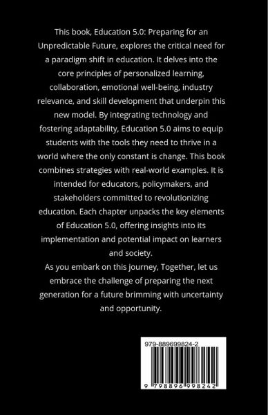 This book, Education 5.0: Preparing for an Unpredictable Future, explores the critical need for a paradigm shift in education. It delves into the core principles of personalized learning, collaboration, emotional well-being, industry relevance, and skill development that underpin this new model. By integrating technology and fostering adaptability, Education 5.0 aims to equip students with the tools they need to thrive in a world where the only constant is change. This book combines strategies with real-world examples. It is intended for educators, policymakers, and stakeholders committed to revolutionizing education. Each chapter unpacks the key elements of Education 5.0, offering insights into its implementation and potential impact on learners and society. Together, let us embrace the challenge of preparing the next generation for a future brimming with uncertainty and opportunity.