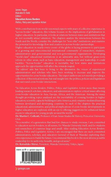 "As a member of a generation that had few chances to study overseas, I am committed to education across borders, in all senses, for Waseda University itself, and for students and researchers of countries large and small. After reading Education Across Borders: Politics, Policy and Legislative Action, I am encouraged that there are such committed administrators, scholars, and educators (several of them at Waseda) exploiting their own experiences to build the future. I recommend this book to the most diverse possible readership for its authority, breadth, and good sense."