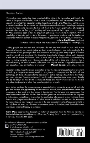 Education and Its Discontents: Teaching, the Humanities, and the Importance of a Liberal Education in the Age of Mass Information, by Mark Moss, is an exploration of how the traditional educational environment, particularly in the post-secondary world, is changing as a consequence of the influx of new technology. Students now have access to myriad of technologies that instead of supplementing the educational process, have actually taken it over. Faculty who do not adapt face enormous obstacles, and those who do adapt run the risk of eroding the integrity of what they have been trained to teach. Moss discusses that it is now not only how we learn, but what we continue to teach, and how that enormously important legacy is protected.