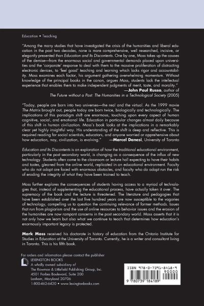 Education and Its Discontents: Teaching, the Humanities, and the Importance of a Liberal Education in the Age of Mass Information, by Mark Moss, is an exploration of how the traditional educational environment, particularly in the post-secondary world, is changing as a consequence of the influx of new technology. Students now have access to myriad of technologies that instead of supplementing the educational process, have actually taken it over. Faculty who do not adapt face enormous obstacles, and those who do adapt run the risk of eroding the integrity of what they have been trained to teach. Moss discusses that it is now not only how we learn, but what we continue to teach, and how that enormously important legacy is protected.