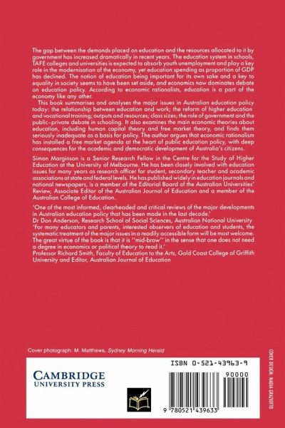 The gap between the demands placed an education and the resources allocated to it by government has increased dramatically in recent years. The education system in schools, TAFE colleges and universities is expected to absorb youth unemployment and play a key role in the modernisation of the economy, yet education spending as proportion of GDP has declined. The notion of education being important for its own sake and a key to equality in society seems to have been set aside, and economics now dominates debate on education policy. According to economic rationalists, education is a part of the economy like any other. This book summarises and analyses the major issues in Australian education policy today: the relationship between education and work; the reform of higher education and vocational training; outputs and resources; class sizes; the role of government and the public-private debate in schooling. It also examines the main economic theories about education, including human capital theory and free market theory, and finds them seriously inadequate as a basis for policy. The author argues that economic rationalism has installed a free market agenda at the heart of public education policy, with deep consequences for the academic and democratic development of Australia's citizens.