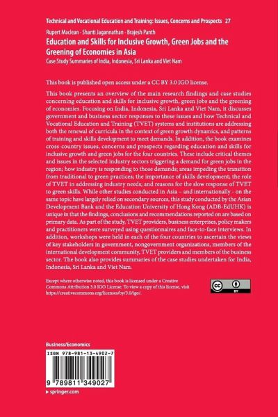 Overview.- Introduction.- Summary of Main Research Findings and Storylines: India, Indonesia, Sri Lanka, Viet Nam.- Case Study of a Private Sector Firm in Indonesia.- A Holistic Approach to Greening TVET: A Case Study and Analysis of Bac Thang Long Economic Technical College Practices.- Summary, Conclusions, and the Way Ahead: Cross-Country Concerns, Issues, and Prospects.