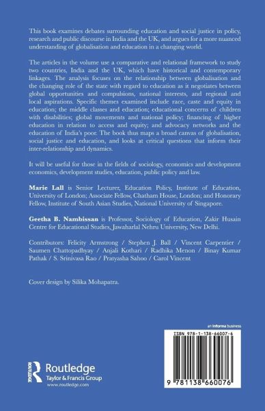 The book discusses the implications of globalization on education from the perspective of social justice. It looks at two countries - India and the UK - to look at how global economic and cultural processes are mediated through nation states, institutional structures and the aspirations of different social groups. It seeks to resituate the debates around education and social justice in policy, research and public discourse by highlighting the need for a more nuanced understanding of globalization and education. It also demonstrates the effects of economic dimensions - the politics of neoliberalism, and how this has shifted the understanding of state responsibilities and marginalized issues pertaining to the agenda of social justice.