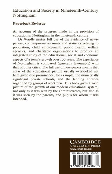 An account of the progress made in the provision of education in Nottingham in the nineteenth century. Dr Wardle makes full use of the evidence of newpapers, contemporary accounts and statistics relating to population, child employment, public health, welfare agencies, and charitable organisations to produce an integrated study of the educational, social and economic aspects of a town's growth over 100 years. The experience of Nottingham is compared (generally favourably) with that of other cities. The full use of newspapers means that areas of the educational picture usually overlooked are here given due prominence; for example, the numerically significant private schools, and the lending libraries organised by groups of workmen. This book gives a vivid picture of the growth of our educational system, not only as it was seen by the administrators, but also as it was seen by the parents, and pupils for whom it was intended.