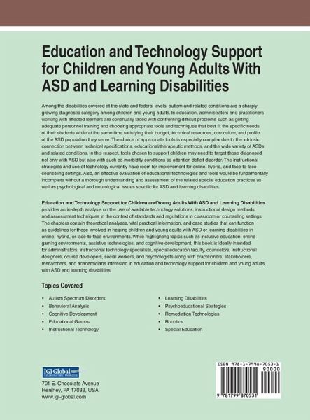 Among the disabilities covered at the state and federal levels, autism and related conditions are a sharply growing diagnostic category among children and young adults. In education, administrators and practitioners working with affected learners are continually faced with confronting difficult problems such as getting adequate personnel training and choosing appropriate tools and techniques that best fit the specific needs of their students while at the same time satisfying their budget, technical resources, curriculum, and profile of the ASD population they serve. The choice of appropriate tools is especially complex due to the intrinsic connection between technical specifications, educational/therapeutic methods, and the wide variety of ASDs and related conditions. In this respect, tools chosen to support children may need to target those diagnosed not only with ASD but also with such co-morbidity conditions as attention deficit disorder. The instructional strategies and use of technology currently have room for improvement for online, hybrid, and face-to-face counseling settings. Also, an effective evaluation of educational technologies and tools would be fundamentally incomplete without a thorough understanding and assessment of the related special education practices as well as psychological and neurological issues specific for ASD and learning disabilities. Education and Technology Support for Children and Young Adults With ASD and Learning Disabilities provides an in-depth analysis on the use of available technology solutions, instructional design methods, and assessment techniques in the context of standards and regulations in classroom or counseling settings. The chapters contain theoretical analyses, vital practical information, and case studies that can function as guidelines for those involved in helping children and young adults with ASD or learning disabilities in online, hybrid, or face-to-face environments. While highlighting topics such as inclusive education, online gaming environments, assistive technologies, and cognitive development, this book is ideally intended for administrators, instructional technology specialists, special education faculty, counselors, instructional designers, course developers, social workers, and psychologists along with practitioners, stakeholders, researchers, and academicians interested in education and technology support for children and young adults with ASD and learning disabilities.