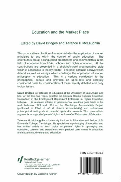 Chapter 1. Education and the Market Place: An Introduction Chapter 2. Schooling Markets and Public Agency 1833-1944 Part 1. Examining Particular Applications of the Market Principles in Practice Chapter 3. Local Education Authorities and the Market Place Chapter 4. In Defence of the Educational Voucher Chapter 5. Diversity in State Education: The Grant Maintained Option Chapter 6. Managing the Market Chapter 7. Parents: Customers or Partners? Chapter 8. Business Sponsorship in Schools: A Changing Climate Chapter 9. Pied Piper Revisited Part 2. The Debate in Philosophical and Educational Chapter 10. Markets Values and Education Chapter 11. Education and the Limits of the Market Chapter 12. Education is a Public Good: On the need to Resist the Domination of Economic Science Chapter 13. In Defence of Markets in Educational Provision Chapter 14. Politics Markets and Schools: The Central Issues Notes on Contributors Index