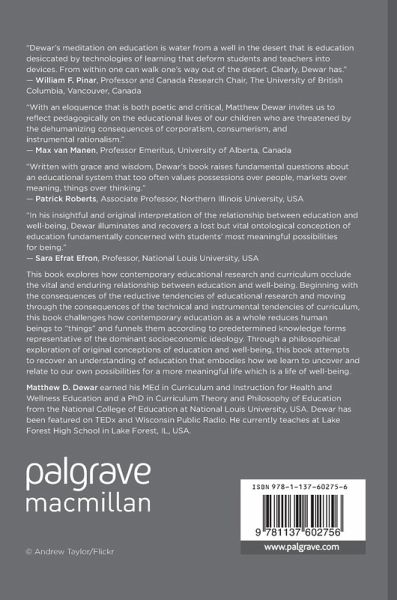 This book explores how contemporary educational research and curriculum occlude the vital and enduring relationship between education and well-being. Beginning with the consequences of the reductive tendencies of educational research and moving through the consequences of the technical and instrumental tendencies of curriculum, this book challenges how contemporary education as a whole reduces human beings to "things" and funnels them according to predetermined knowledge forms representative of the dominant socioeconomic ideology. Through a philosophical exploration of original conceptions of education and well-being, this book attempts to recover an understanding of education that embodies how we learn to uncover and relate to our own possibilities for a more meaningful life which is a life of well-being.