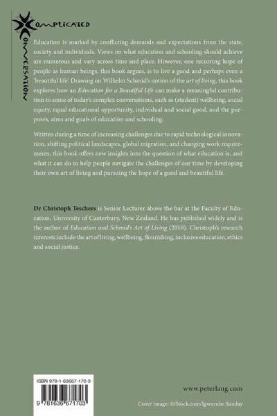 Education is marked by conflicting demands and expectations from the state, society and individuals. Views on what education and schooling should achieve are numerous and vary across time and place. However, one recurring hope of people as human beings, this book argues, is to live a good and perhaps even a 'beautiful life'. Drawing on Wilhelm Schmid's notion of the art of living, this book explores how an Education for a Beautiful Life can make a meaningful contribution to some of today's complex conversations, such as (student) wellbeing, social equity, equal educational opportunity, individual and social good, and the purposes, aims and goals of education and schooling.