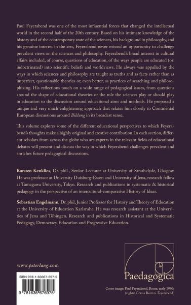 Paul Feyerabend was one of the most influential forces that changed the intellectual world in the second half of the 20th century. Based on his intimate knowledge of the history and of the contemporary state of the sciences, his background in philosophy, and his genuine interest in the arts, Feyerabend never missed an opportunity to challenge prevalent views on the sciences and philosophy. Feyerabend's broad interest in cultural affairs included, of course, questions of education, of the ways people are educated (or: indoctrinated) into scientific beliefs and worldviews. He always was appalled by the ways in which sciences and philosophy are taught as truths and as facts rather than as imperfect, questionable theories or, even better, as practices of searching and philosophizing. His reflections touch on a wide range of pedagogical issues, from questions around the shape of educational theories or the role the sciences play or should play in education to the discussion aroundeducational aims and methods. He proposed a unique and very much enlightening approach that relates him closely to Continental European discussions around Bildung in its broadest sense.