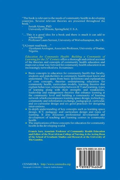 This book presents a thorough and critical account of the theories and concepts of community health education in an increasingly networked era. It examines basic concepts in education for community health; in-depth understanding of concepts such as learning space design, ICT, pedagogy and curriculum design and types of learning. It discusses professional development and development of teaching and learning centres in community health and implications of the concepts for education in community health in the developing world. Francis Sarr is Associate Professor of Community Health Education at the University of The Gambia.