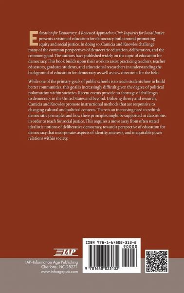 This book presents a vision of education for democracy built around promoting equity and social justice. In doing so, Camicia and Knowles challenge many of the common perspectives of democratic education, deliberation, and the common good. The authors have published widely on the topic of education for democracy. This book builds upon their work to assist practicing teachers, teacher educators, graduate students, and educational researchers in understanding the background of education for democracy, as well as new directions for the field. While one of the primary goals of public schools is to teach students how to build better communities, this goal is increasingly difficult given the degree of political polarization within societies. Recent events provide no shortage of challenges to democracy in the United States and beyond. Utilizing theory and research, Camicia and Knowles promote instructional methods that are responsive to changing cultural and political contexts. There is an increasing need to rethink democratic principles and how these principles might be supported in classrooms in order to teach for social justice. This requires a move away from often stated idealistic notions of deliberative democracy, toward a perspective of education for democracy that incorporates aspects of identity, interests, and inequitable power relations within society.