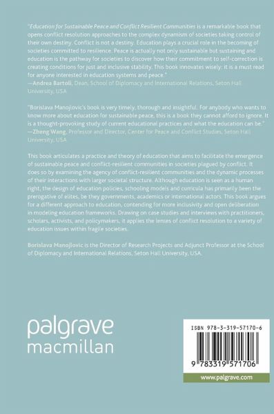 This book articulates a practice and theory of education that aims to facilitate the emergence of sustainable peace and conflict-resilient communities in societies plagued by conflict. It does so by examining the agency of conflict-resilient communities and the dynamic processes of their interactions with larger societal structure. Although education is seen as a human right, the design of education policies, schooling models and curricula has primarily been the prerogative of elites, be they governments, academics or international actors. This book argues for a different approach to education, contending for more inclusivity and open deliberation in modeling education frameworks. Drawing on case studies and interviews with practitioners, scholars, activists, and policymakers, it applies the lenses of conflict resolution to a variety of education issues within fragile societies.