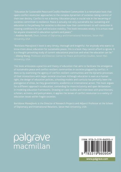 This book articulates a practice and theory of education that aims to facilitate the emergence of sustainable peace and conflict-resilient communities in societies plagued by conflict. It does so by examining the agency of conflict-resilient communities and the dynamic processes of their interactions with larger societal structure. Although education is seen as a human right, the design of education policies, schooling models and curricula has primarily been the prerogative of elites, be they governments, academics or international actors. This book argues for a different approach to education, contending for more inclusivity and open deliberation in modeling education frameworks. Drawing on case studies and interviews with practitioners, scholars, activists, and policymakers, it applies the lenses of conflict resolution to a variety of education issues within fragile societies.