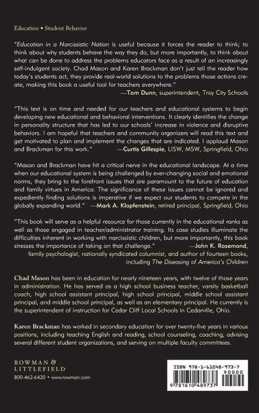 Foreword Preface Acknowledgments Introduction Chapter OneA Narcissistic Society Chapter TwoNarcissism Defined Chapter ThreeSocietal Implications Chapter FourStages of Child Development Chapter FiveNarcissistic Parents in the School Setting Chapter SixNarcissistic Students in the School Setting Chapter SevenEducation's Role in the Growth of Narcissism Chapter EightStrategies for Examining and Reducing Narcissism in Schools Chapter NineUnderstanding and Addressing the Narcissistic Point-of-View Chapter TenAn Examination of Case Studies Conclusion and Recommended Readings About the Authors References