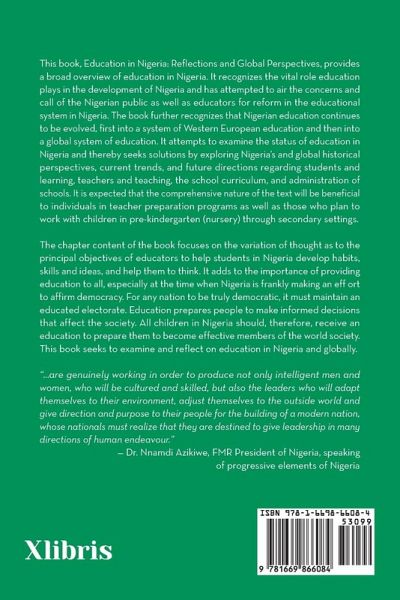 This book, Education in Nigeria: Reflections and Global Perspectives, provides a broad overview of education in Nigeria. It recognizes the vital role education plays in the development of Nigeria and has attempted to air the concerns and call of the Nigerian public as well as educators for reform in the educational system in Nigeria. The book further recognizes that Nigerian education continues to be evolved, first into a system of Western European education and then into a global system of education. It attempts to examine the status of education in Nigeria and thereby seeks solutions by exploring Nigeria's and global historical perspectives, current trends, and future directions regarding students and learning, teachers and teaching, the school curriculum, and administration of schools. It is expected that the comprehensive nature of the text will be beneficial to individuals in teacher preparation programs as well as those who plan to work with children in pre-kindergarten (nursery) through secondary settings. The chapter content of the book focuses on the variation of thought as to the principal objectives of educators to help students in Nigeria develop habits, skills and ideas, and help them to think. It adds to the importance of providing education to all, especially at the time when Nigeria is frankly making an eff ort to affirm democracy. For any nation to be truly democratic, it must maintain an educated electorate. Education prepares people to make informed decisions that affect the society. All children in Nigeria should, therefore, receive an education to prepare them to become effective members of the world society. This book seeks to examine and reflect on education in Nigeria and globally. "...are genuinely working in order to produce not only intelligent men and women, who will be cultured and skilled, but also the leaders who will adapt themselves to their environment, adjust themselves to the outside world and give direction and purpose to their people for the building of a modern nation, whose nationals must realize that they are destined to give leadership in many directions of human endeavour." ~ Dr. Nnamdi Azikiwe, FMR President of Nigeria, speaking of progressive elements of Nigeria