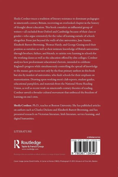 Sheila Cordner traces a tradition of literary resistance to dominant pedagogies in nineteenth-century Britain, recovering an overlooked chapter in the history of thought about education. This book considers an influential group of writers - all excluded from Oxford and Cambridge because of their class or gender - who argue extensively for the value of learning outside of schools altogether. From just beyond the walls of elite universities, Jane Austen, Elizabeth Barrett Browning, Thomas Hardy, and George Gissing used their position as outsiders as well as their intimate knowledge of British universities through brothers, fathers, and friends, to satirize rote learning in schools for the working classes as well as the education offered by elite colleges. Cordner analyzes how predominant educational rhetoric, intended to celebrate England's progress while simultaneously controlling the spread of knowledge to the masses, gets recast not only by the four primary authors in this book but also by insiders of universities, who fault schools for their emphasis on memorization. Drawing upon working-men's club reports, student guides, educational pamphlets, and materials from the National Home Reading Union, as well as recent work on nineteenth-century theories of reading, Cordner unveils a broader cultural movement that embraced the freedom of learning on one's own.