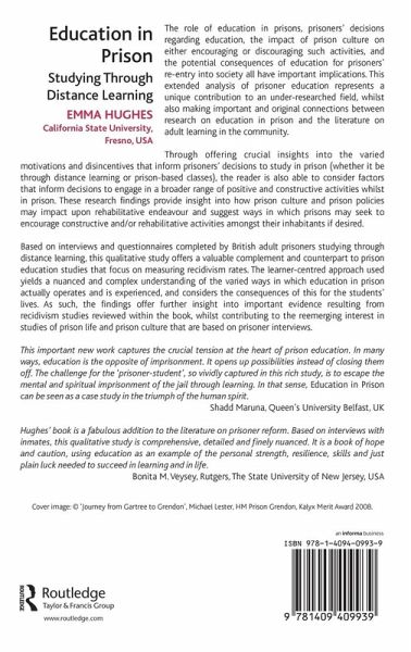 The role of education in prisons, prisoners' decisions regarding education, the impact of prison culture on either encouraging or discouraging such activities, and the potential consequences of education for prisoners' reentry into society all have important implications. This extended analysis of prisoner education represents a unique contribution to an under-researched field, whilst also making important and original connections between research on education in prison and the literature on adult learning in the community. Through offering crucial insights into the varied motivations and disincentives that inform prisoners' decisions to study in prison (whether it be through distance learning or prison-based classes), the reader is also able to consider factors that inform decisions to engage in a broader range of positive and constructive activities whilst in prison. These research findings provide insight into how prison culture and prison policies may impact upon rehabilitative endeavour and suggest ways in which prisons may seek to encourage constructive and/ or rehabilitative activities amongst their inhabitants if desired. Based on interviews and questionnaires completed by British adult prisoners studying through distance learning, this qualitative study offers a valuable complement and counterpart to prison education studies that focus on measuring recidivism rates. The learner-centred approach used yields a nuanced and complex understanding of the varied ways in which education in prison actually operates and is experienced, and considers the consequences of this for the students' lives. As such, the findings offer further insight into important evidence resulting from recidivism studies reviewed within the book, whilst contributing to the reemerging interest in studies of prison life and prison culture that are based on prisoner interviews.