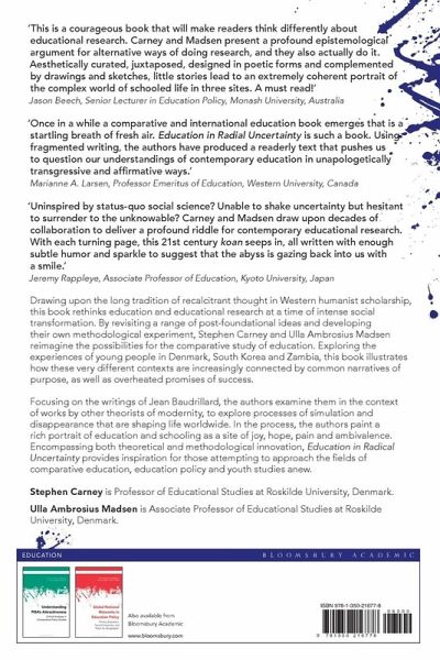 Drawing upon the long tradition of recalcitrant thought in Western humanist scholarship, this book rethinks education and educational research at a time of intense social transformation. By revisiting a range of post-foundational ideas and developing their own methodological experiment, Stephen Carney and Ulla Ambrosius Madsen reimagine the possibilities for the comparative study of education. Exploring the experiences of young people in Denmark, South Korea and Zambia, this book illustrates how these very different contexts are increasingly connected by common narratives of purpose, as well as overheated promises of success. Focusing on the writings of Jean Baudrillard, the authors examine them in the context of works by other theorists of modernity, to explore processes of simulation and disappearance that are shaping life worldwide. In the process, the authors paint a rich portrait of education and schooling as a site of joy, hope, pain and ambivalence. Encompassing both theoretical and methodological innovation, Education in Radical Uncertainty provides inspiration for scholars and students attempting to approach the fields of comparative education, education policy and youth studies anew.