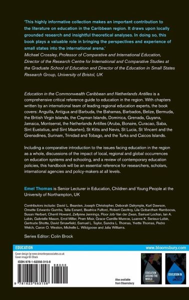 Education in the Commonwealth Caribbean and Netherlands Antilles provides a contemporary survey of education development and key educational issues in the region. The chapters cover: Anguilla, Antigua and Barbuda, the Bahamas, Barbados, Belize, Bermuda, the British Virgin Islands, the Cayman Islands, Dominica, Grenada, Guyana, Jamaica, the Netherlands Antilles (Aruba, Bonaire, Curacao, Saba, Saint Eustatius and Saint Maarteen), Montserrat, Saint Kitts and Nevis, Saint Lucia, Saint Vincent and the Grenadines, Surinam, Trinidad and Tobago, and the Turks and Caicos Islands. The book includes discussions of the impact of local, regional and global occurrences, including social, political and geographical events, on education systems and schooling in the region. As a whole, the book provides a comprehensive reference resource for contemporary education policies in the Caribbean, and explores some of the problems these countries face during the process of development. It is an essential reference for researchers, scholars, international agencies and policy-makers at all levels.