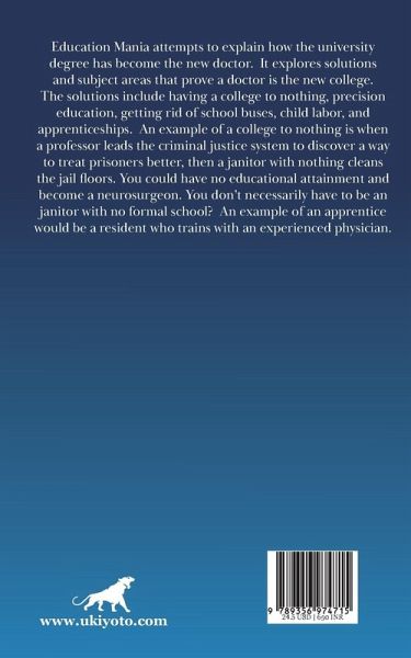 Education Mania attempts to explain how the university degree has become the new doctor. It explores solutions and subject areas that prove a doctor is the new college. The solutions include having a college to nothing, precision education, getting rid of school buses, child labor, and apprenticeships. An example of a college to nothing is when a professor leads the criminal justice system to discover a way to treat prisoners better, then a janitor with nothing cleans the jail floors. You could have no educational attainment and become a neurosurgeon. You don't necessarily have to be an janitor with no formal school? An example of an apprentice would be a resident who trains with an experienced physician.
