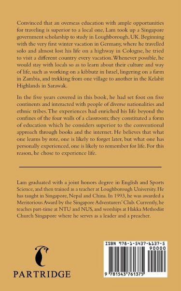 Convinced that an overseas education with ample opportunities for traveling is superior to a local one, Lam took up a Singapore government scholarship to study in Loughborough, UK. Beginning with the very first winter vacation in Germany, where he travelled solo and almost lost his life on a highway in Cologne, he tried to visit a different country every vacation. Whenever possible, he would stay with locals so as to learn about their culture and way of life, such as working on a kibbutz in Israel, lingering on a farm in Zambia, and trekking from one village to another in the Kelabit Highlands in Sarawak. In the five years covered in this book, he had set foot on five continents and interacted with people of diverse nationalities and ethnic tribes. The experiences had enriched his life beyond the confines of the four walls of a classroom; they constituted a form of education which he considers superior to the conventional approach through books and the internet. He believes that what one learns by rote, one is likely to forget later, but what one has personally experienced, one is likely to remember for life. For this reason, he chose to experience life.