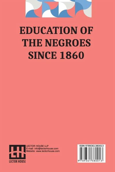 NEW PRINT WITH PROFESSIONAL TYPE-SET IN CONTRAST TO SCANNED PRINTS OFFERED BY OTHERS Education Of The Negroes Since 1860 This book is a result of an effort made by us towards making a contribution to the preservation and repair of original classic literature. In an attempt to preserve, improve and recreate the original content, we have worked towards: 1. Type-setting & Reformatting: The complete work has been re-designed via professional layout, formatting and type-setting tools to re-create the same edition with rich typography, graphics, high quality images, and table elements, giving our readers the feel of holding a fresh and newly reprinted and/or revised edition, as opposed to other scanned & printed (Optical Character Recognition - OCR) reproductions. 2. Correction of imperfections: As the work was re-created from the scratch, therefore, it was vetted to rectify certain conventional norms with regard to typographical mistakes, hyphenations, punctuations, blurred images, missing content/pages, and/or other related subject matters, upon our consideration. Every attempt was made to rectify the imperfections related to omitted constructs in the original edition via other references. However, a few of such imperfections which could not be rectified due to intentional\unintentional omission of content in the original edition, were inherited and preserved from the original work to maintain the authenticity and construct, relevant to the work.