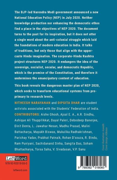 The BJP-led Narendra Modi government announced a new National Education Policy (NEP) in July 2020. Neither knowledge production nor enhancing the democratic ethos find a place in the objectives of NEP 2020. The document turns to the past for its inspiration, but it does not utter a single word about the anti-colonial struggle which laid the foundations of modern education in India. It talks of traditions, but only those that align with the upper-caste Hindu imagination. The corporate-Hindu Rashtra project structures NEP 2020. It endangers the idea of the sovereign, socialist, secular, and democratic Republic, which is the promise of the Constitution, and therefore it undermines the emancipatory content of education. This book reveals the dangerous master plan of NEP 2020, which seeks to transform educational systems from pre-primary to research levels. CONTRIBUTORS: Aishe Ghosh, Ajsal E. A., A.R. Sindhu, Ashique Ali Thuppilikkat, Dayal Paleri, Debodeep Banerjee, Dinit Denta, L. Jawahar Nesan, Madhu Prasad, Malini Battacharya, Mayukh Biswas, Mukulika Radhakrishnan, Parichay Yadav, Prabhat Patnaik, Rohan D'souza, R. Bindu, Ram Puniyani, Sachidanand Sinha, Sangita Das, Soham Bhattacharya, Torsa Saha, V. Sivadasan, V.P. Sanu