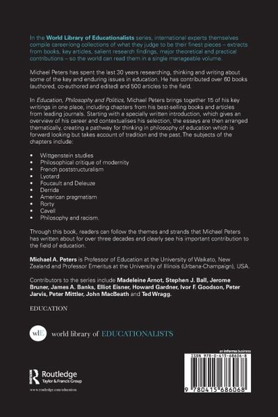 In the World Library of Educationalists series, international experts themselves compile career-long collections of what they judge to be their finest pieces - extracts from books, key articles, salient research findings, major theoretical and/practical contributions - so the world can read them in a single manageable volume. Readers will be able to follow the themes and strands of their work and see their contribution to the development of a field. Michael Peters has spent the last 30 years researching, thinking and writing about some of the key and enduring issues in education. He has contributed over 50 books (authored, co-authored and edited) and 500 articles to the field. In Educational Philosophy and Politics, Michael Peters brings together over 20 of his key writings in one place, including chapters from his best-selling books and articles from leading journals. Starting with a specially written Introduction, which gives an overview of Michael's career and contextualises his selection, the chapters are divided into 5 sections: * Wittgenstein Studies * Philosophical Critique of Modernity * French Poststructuralism - Jean-Francois Lyotard - Foucault & Deleuze - Derrida * American Pragmatism - Rorty - Cavell - Philosophy and racism * Applied educational philosophy Through this book, readers can follow the themes and strands that Michael Peters has written about for over three decades and clearly see his important contribution to the field of education.