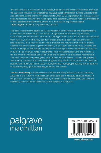 This book focuses on the politics of teacher resistance to the formation and implementation of neoliberal education policies in Australia. It argues that policies such as publishing examination test results online amounts to auditing teachers' work, and assumes incompetence from teachers, which ultimately results in diverting teachers from their true professional responsibilities. The book outlines the rise of transnational networks that promote market-oriented methods of achieving social objectives, such as good education for all students, and considers a range of explanations for why this education policy was strengthened in Australia in 2010. It also reviews a range of arguments about professional unionism, and reflects on the history of the Australian Education Union and its capacity to resist social neoliberalism. The book concludes by reporting on a case-study in which principals, teachers and parents at two ordinary schools in Australia have managed to keep market forcesat bay. It will appeal to students and researchers in the fields of education and sociology, particularly those interested in education policy, political ideology, unionism, and schools.