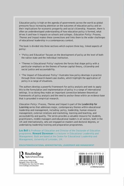 The study of educational leadership makes little sense unless it is in relation to who the leaders are, how they are leading, what is being led, and with what effect. Based on the premise that learning is at the heart of leadership and that leaders themselves should be learners, the Leadership for Learning series explores the connections between educational leadership, policy, curriculum, human resources and accountability. Each book in the series approaches its subject matter through a three-fold structure of process, themes and impact. Series Editors - Clive Dimmock, Mark Brundrett and Les Bell As global pressures focus increasing attention on the outcomes of education policy and on their implications for economic prosperity and social citizenship, the experience of each individual learner is decisively shaped by the wider policy environment. However, there is often an underdeveloped understanding of how education policy is formed, what drives it and how it impacts on schools and colleges. This book explicitly makes these connections and links them to the wider challenges of educational leadership in a modern context. Education Policy is divided into three sections, which examine: the development of policy at the levels of the nation state and individual institutions the forces that shape policies with emphasis on human capital theory, citizenship and social justice and accountability research-based case studies highlighting the application of policy in a range of situations. The book provides a valuable resource for students, practitioners, middle managers and educational leaders in all sectors, both in the UK and internationally, who are engaged on masters and doctoral degrees, or undertaking leadership training and preparation programmes.