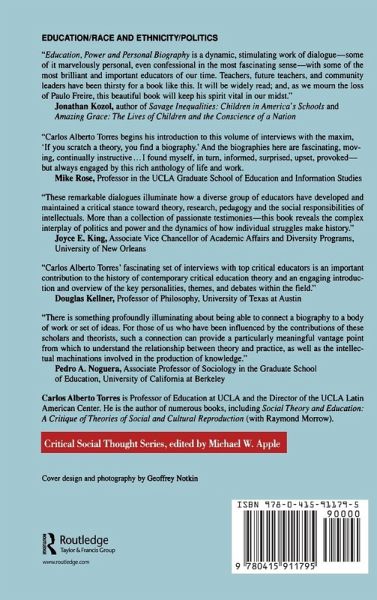 In dialogues with eleven key thinkers in the area of critical education, "Education, Power, and Personal Biography" documents how a tradition of study grew in the United States. Through in-depth interviews, Carlos Alberto Torres asks each of these thinkers to talk about the relationship between their personal experiences and their academic work. The reader will learn, through listening to these intellectual, political and personal biographies, how and why these individual scholars have struggled for more than three decades to expand the borders of critical education studies. Interviews are held with Henry Giroux, Henry Levin, Herbert Gintis, Jeannie Oakes, Martin Carnoy, Maxine Greene, Michael Apple, Samuel Bowles, Paulo Freire, Gloria Lanson-Billings and Geoff Whitty.