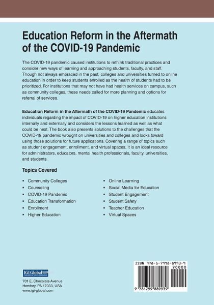 The COVID-19 pandemic caused institutions to rethink traditional practices and consider new ways of learning and approaching students, faculty, and staff. Though not always embraced in the past, colleges and universities turned to online education in order to keep students enrolled as the health of students had to be prioritized. For institutions that may not have had health services on campus, such as community colleges, these needs called for more planning and options for referral of services. Education Reform in the Aftermath of the COVID-19 Pandemic educates individuals regarding the impact of COVID-19 on higher education institutions internally and externally and considers the lessons learned as well as what could be next. The book also presents solutions to the challenges that the COVID-19 pandemic wrought on universities and colleges and looks toward using those solutions for future applications. Covering a range of topics such as student engagement, enrollment, and virtual spaces, it is an ideal resource for administrators, educators, mental health professionals, faculty, universities, and students.