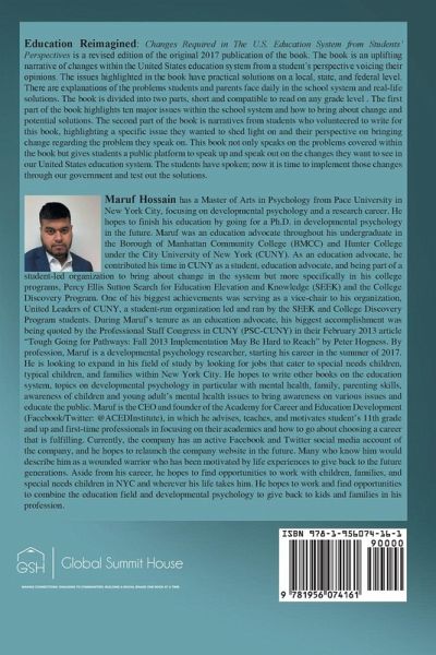 Education Reimagined: Changes Required in The U.S. Education System from Students' Perspectives is a revised edition of the original 2017 publication of the book. The book is an uplifting narrative of changes within the United States education system from a student's perspective voicing their opinions. The issues highlighted in the book have practical solutions on a local, state, and federal level. There are explanations of the problems students and parents face daily in the school system and real-life solutions. The book is divided into two parts, short and compatible to read on any grade level . The first part of the book highlights ten major issues within the school system and how to bring about change and potential solutions. The second part of the book is narratives from students who volunteered to write for this book, highlighting a specific issue they wanted to shed light on and their perspective on bringing change regarding the problem they speak on. This book not only speaks on the problems covered within the book but gives students a public platform to speak up and speak out on the changes they want to see in our United States education system. The students have spoken; now it is time to implement those changes through our government and test out the solutions.