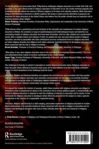 "In this thoughtful and provocative book Philip Barnes challenges religious educators to re-think their field, and proposes a new, post-liberal model of religious education to help them do so. His model both confronts prejudice and intolerance and also allows the voices of different religions to be heard and critically explored. While Education, Religion and Diversity is directed to a British audience the issues it raises and the alternative it proposes are important for those educators in the United States who believe that the public schools have an important role in teaching students about religion." Walter Feinberg, Professor Emeritus of Education Policy, Organization and Leadership at the University of Illinois, Urbana-Champaign.¿ "Philip Barnes offers a penetrating and lucid analysis of the strengths and weaknesses of modern religious education in Britain. He considers a range of epistemological and methodological issues and identifies two contrasting models of religious education that have been influential, what he calls a liberal and a postmodern model. After a detailed review and criticism of both, he outlines his own new post-liberal model of religious education, one that is compatible with both confessional and non-confessional forms of religious education, yet takes religious diversity and religious truth claims seriously. Essential reading for all religious educators and those concerned with the role of religion in schools." Bernd Schröder, Professor of Practical Theology and Religious Education, University of Göttingen. "What place, if any, does religious education have in the schools of an increasingly diverse society? This lucid and authoritative book makes an incisive contribution to this crucial debate." Roger Trigg is Emeritus Professor of Philosophy, University of Warwick, and Senior Research Fellow, Ian Ramsey Centre, Oxford. The challenge of diversity is central to education in modern liberal, democratic states, and religious education is often the point where these differences become both most acute and where it is believed, of all curriculum subjects, resolutions are most likely to be found.¿ Education, Religion and Diversity identifies and explores the commitments and convictions that have guided post-confessional religious education and concludes controversially that the subject as currently theorised and practised is incapable of challenging religious intolerance and of developing respectful relationships between people from different communities and groups within society. It is argued that despite the rhetoric of success, which religious education is obliged to rehearse in order to perpetuate its status in the curriculum and to ensure political support, a fundamentally new model of religious education is required to meet the challenge of diversity to education and to society. A new framework for religious education is developed which offers the potential for the subject to make a genuine contribution to the creation of a responsible, respectful society. Education, Religion and Diversity is a wide-ranging, provocative exploration of religious education in modern liberal democracies.¿It is essential reading for those concerned with the role of religion in education and for religious and theological educators who want to think critically about the aims and character of religious education.