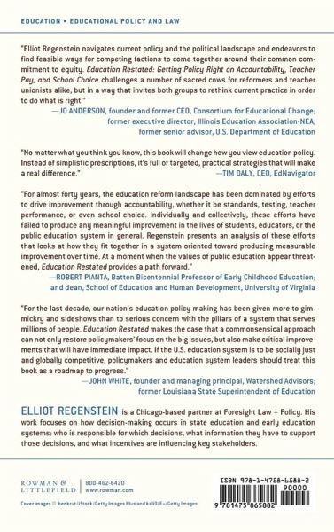Education Restated: Getting Policy Right on Accountability, Teacher Pay, and School Choice offers the education policy community a roadmap for change in three hot-button policy areas. In each of these areas policy has been anchored around the wrong core values. By putting the right core values at the heart of policy, state governments can create more favorable conditions for education improvement at the local level. Education Restated takes a pragmatic approach to policy change, recognizing that the forces that created today's policies have not gone away-and that on complex issues there are legitimate competing interests. This book harmonizes the best ideas of opposing policy camps and identifies opportunities to strengthen connections between K-12 and early childhood. For advocates seeking common ground with historical adversaries, Education Restated provides some ideas on where they might find it.