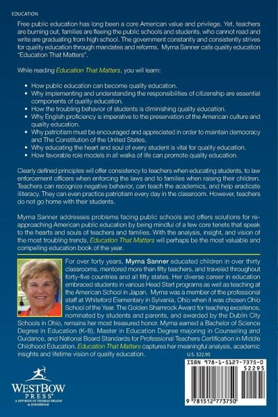 Free public education has long been a core American value and privilege. Yet, teachers are burning out, families are fleeing the public schools and students, who cannot read and write are graduating from high school. The government constantly and consistently strives for quality education through mandates and reforms. Myrna Sanner calls quality education Education That Matters. While reading Education That Matters, you will learn: • How public education can become quality education. • Why implementing and understanding the responsibilities of citizenship are essential components of quality education. • How the troubling behavior of students is diminishing quality education. • Why English proficiency is imperative to the preservation of the American culture and quality education. • Why patriotism must be encouraged and appreciated in order to maintain democracy and The Constitution of the United States. • Why educating the heart and soul of every student is vital for quality education. • How favorable role models in all walks of life can promote quality education. Clearly defined principles will offer consistency to teachers when educating students, to law enforcement officers when enforcing the laws and to families when raising their children. Teachers can recognize negative behavior, can teach the academics, and help eradicate illiteracy. They can even practice patriotism every day in the classroom. However, teachers do not go home with their students. Myrna Sanner addresses problems facing public schools and offers solutions for re-approaching American public education by being mindful of a few core tenets that speak to the hearts and souls of teachers and families. With the analysis, insight, and vision of the most troubling trends, Education That Matters will perhaps be the most valuable and compelling education book of the year.