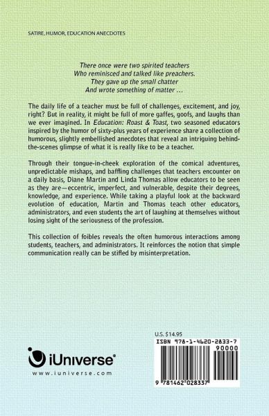 There once were two spirited teachers Who reminisced and talked like preachers. They gave up the small chatter And wrote something of matter ... The daily life of a teacher must be full of challenges, excitement, and joy, right? But in reality, it might be full of more gaffes, goofs, and laughs than we ever imagined. In Education: Roast & Toast, two seasoned educators inspired by the humor of sixty-plus years of experience share a collection of humorous, slightly embellished anecdotes that reveal an intriguing behind-the-scenes glimpse of what it is really like to be a teacher. Through their tongue-in-cheek exploration of the comical adventures, unpredictable mishaps, and baffling challenges that teachers encounter on a daily basis, Diane Martin and Linda Thomas allow educators to be seen as they are-eccentric, imperfect, and vulnerable, despite their degrees, knowledge, and experience. While taking a playful look at the backward evolution of education, Martin and Thomas teach other educators, administrators, and even students the art of laughing at themselves without losing sight of the seriousness of the profession. This collection of foibles reveals the often humorous interactions among students, teachers, and administrators. It reinforces the notion that simple communication really can be stifl ed by misinterpretation.