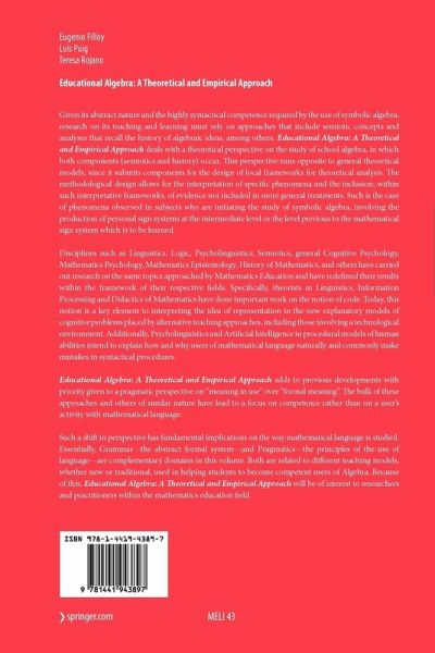 Educational Algebra: A Theoretical and Empirical Approach adds to previous developments with priority given to a pragmatic perspective on "meaning in use" over "formal meaning". The bulk of these approaches and others of similar nature have lead to a focus on competence rather than on a user's activity with mathematical language.